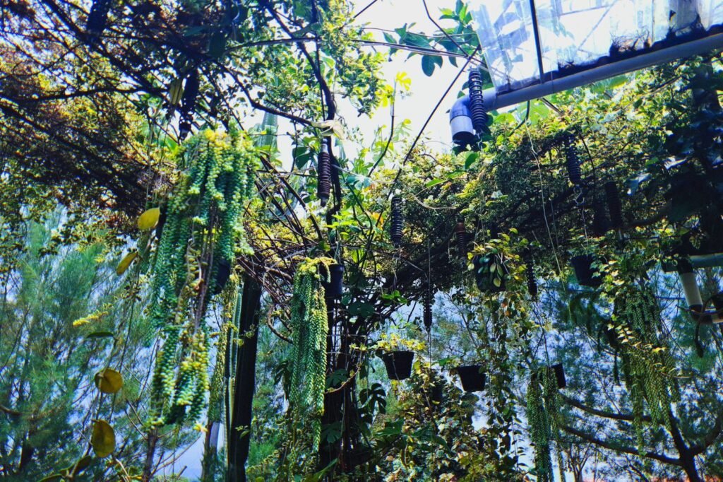 Tanaman-tanaman tinggi ditempatkan di titik rawan panas. Yang rimbun dibiarkan memayungi meja-meja luar. Yang tahan teduh berada di bawah lampu-lampu bekas yang dialihfungsikan. Semua tertata seperti taman hutan mini.