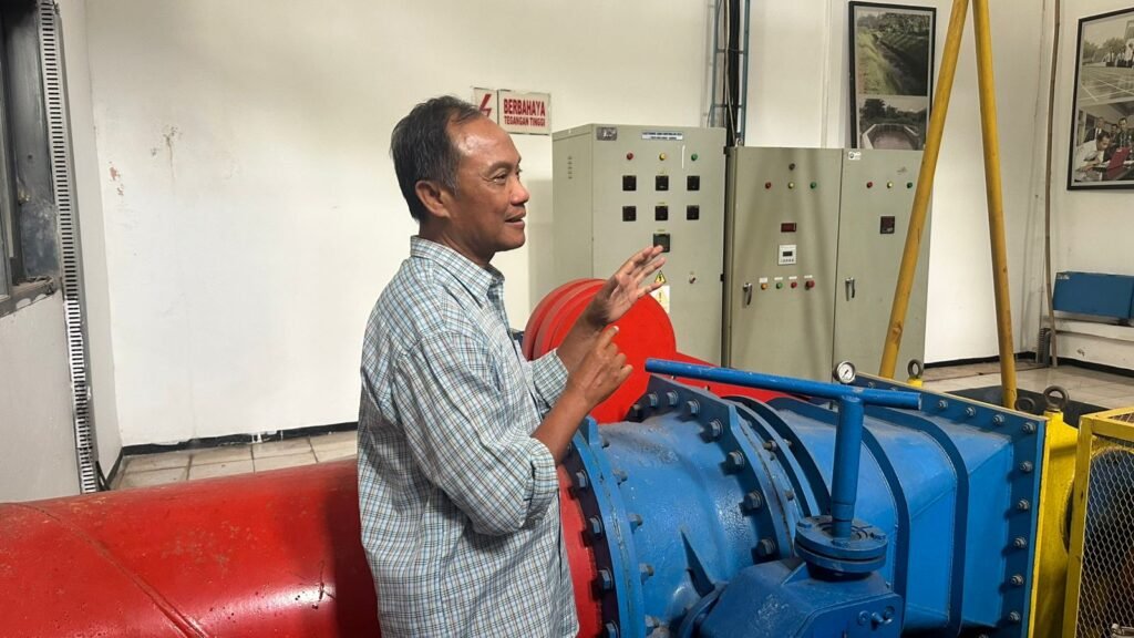 Seseorang pengelola PLTMH menjelaskan sistem kerja Pembangkit Listrik Tenaga Mikrohidro yang mengubah aliran air menjadi sumber energi listrik ramah lingkungan.