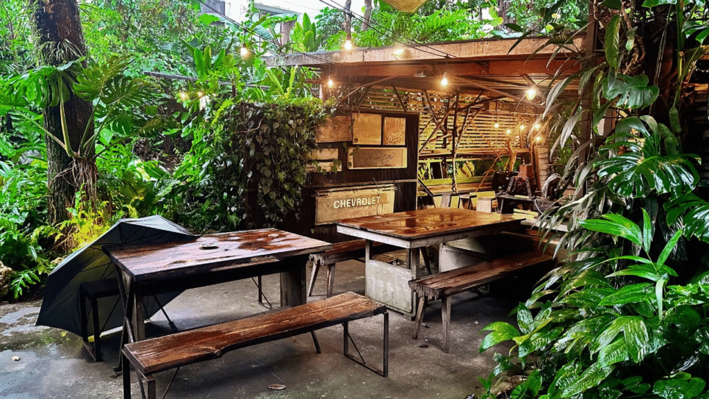 Gartenhaus menghadirkan ruang outdoor yang benar-benar terasa seperti kebun. Monstera, tanaman hias langka, hingga pohon kopi tumbuh di berbagai sudut.